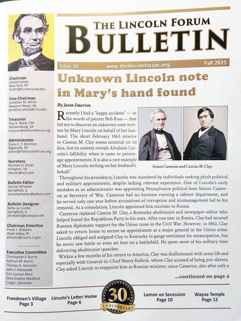 Article: “Unknown Lincoln Note in Mary’s Hand Found,” Lincoln Forum Bulletin (Fall 2025)
