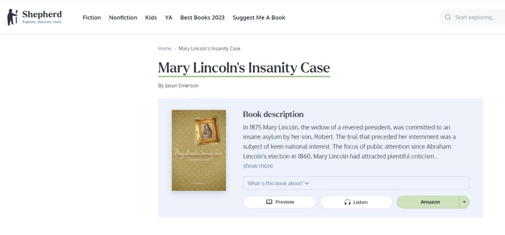 Check out my book’s page at Shepherd.com to see why readers picked Mary Lincoln’s Insanity Case as one of their favorite books, as well as suggestions for similar titles you may like!